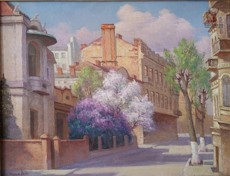 Художник Осадца Зеновій, член спілки художників України. Картина "Вулиця Шопена весною. Івано-Франківськ". Виконання 2017 року. Полотно, олійні фарби. Розмір 70*90 см. В рамці.