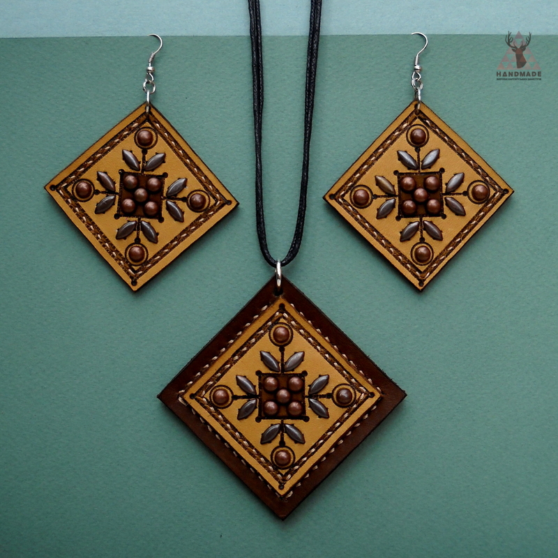Комплект кулон і сережки. Розміри 6.5*6.5 см - сережки і 8.5*8.5 см - кулон. Матеріали: шкіра, морилка, мідні "крабики", металева фурнітура, синтетична нитка. Техніки: випалювання, тонування, оздоблення металом та ручне прошиття.