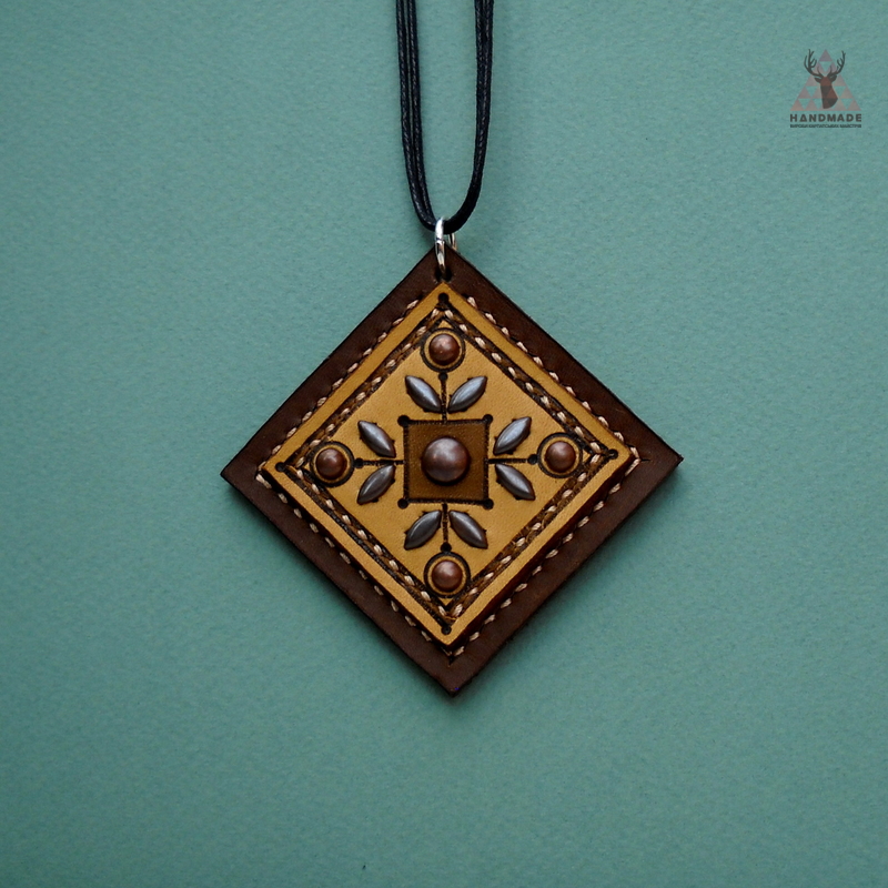 Кулон. Размеры: 8.5*8.5 см. Материалы: кожа, морилка, медные "крабики", металлическая фурнитура, синтетическая нить. Техники: выжигание, тонировка, отделка металлом и ручная прошивка.