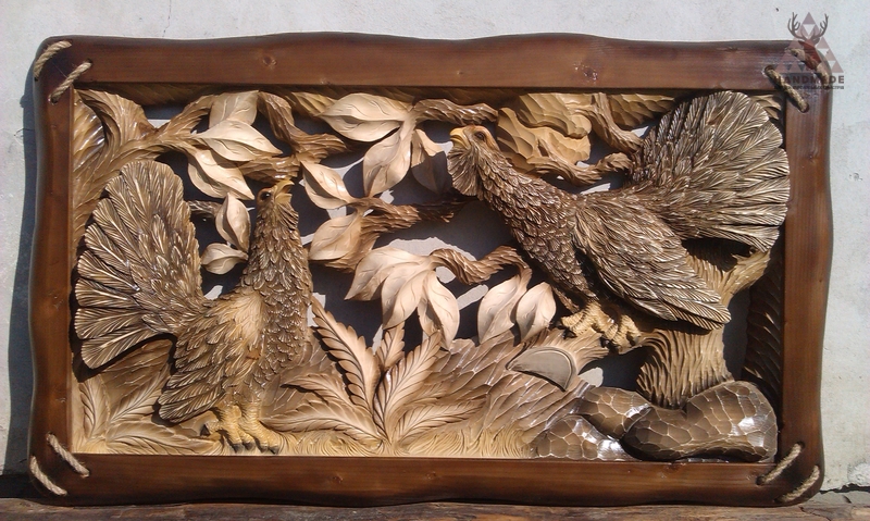 Рельєфне панно із зображенням тетеруків. Різьблені картини з дерева використовуються як самостійні вироби у вигляді сувенірів, прикраси інтер'єру, а також як елементи оздоблення фасадів меблів, дверей або шафи, стінових панелей тощо.