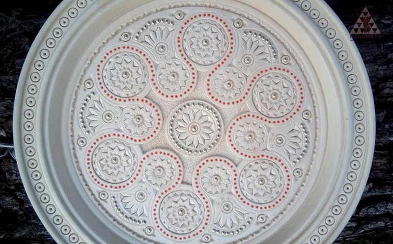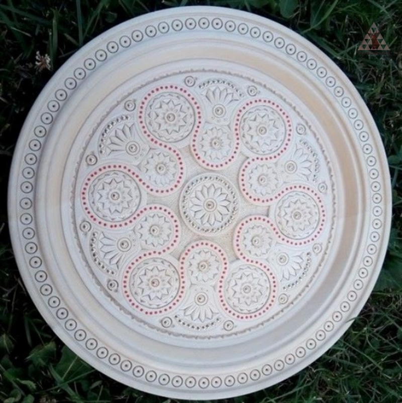 Резная деревянная тарелка ручной работы, инкрустирована бисером и металлом, диаметром 32 см.