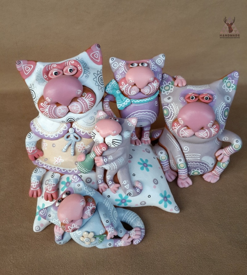 Кошачья семейка на подушечке. Скульптурки, косовская керамика. Размеры 17.5*10 см. Срок изготовления - 30 дней.