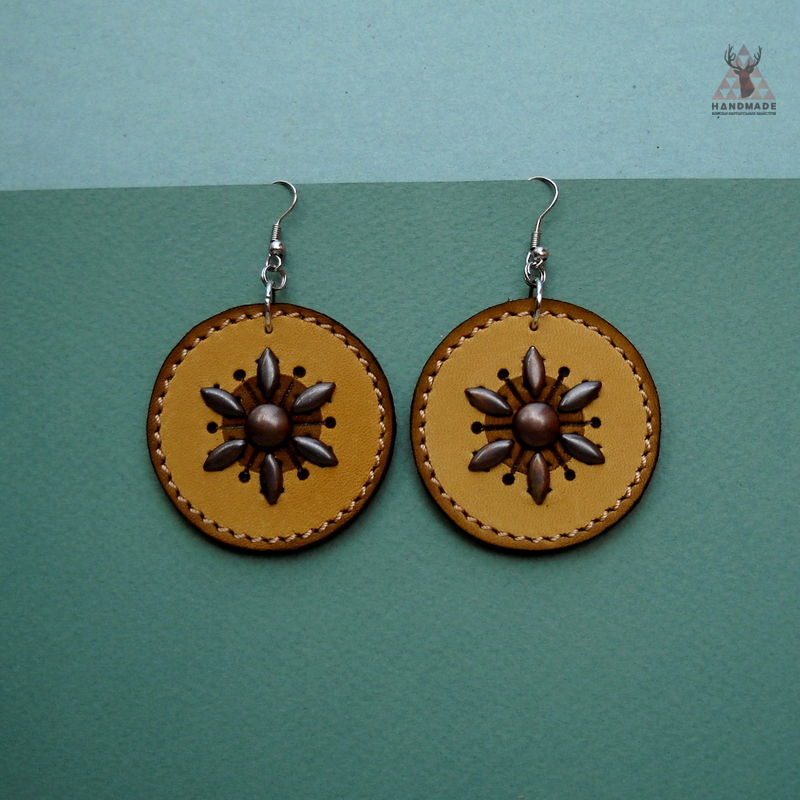 Серьги. Размеры: диаметр 4.5 см. Материалы: кожа, морилка, медные "крабики", металлическая фурнитура, синтетическая нить. Техники: выжигание, тонировка, отделка металлом и ручная прошивка.
