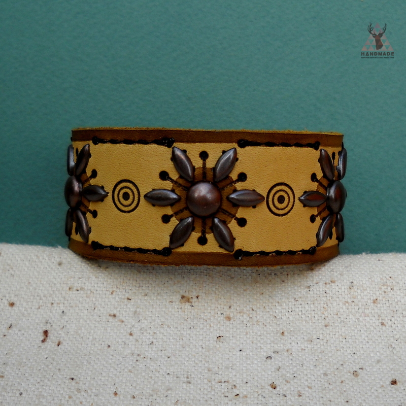 Браслет, размером 23*3.2 см. Материалы: кожа, морилка, медные "крабики", металлическая фурнитура, синтетическая нить. Техники: выжигание, тонировка, отделка металлом и ручной пошив.