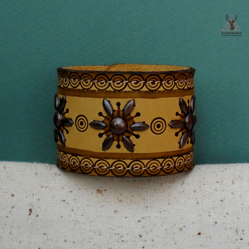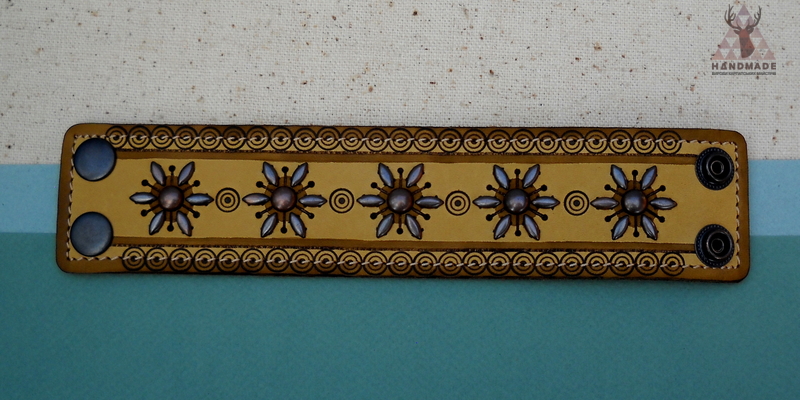 Браслет, размером 23*5 см. Материалы: кожа, морилка, медные "крабики", металлическая фурнитура, синтетическая нить. Техники: выжигание, тонировка, отделка металлом и прошивка.