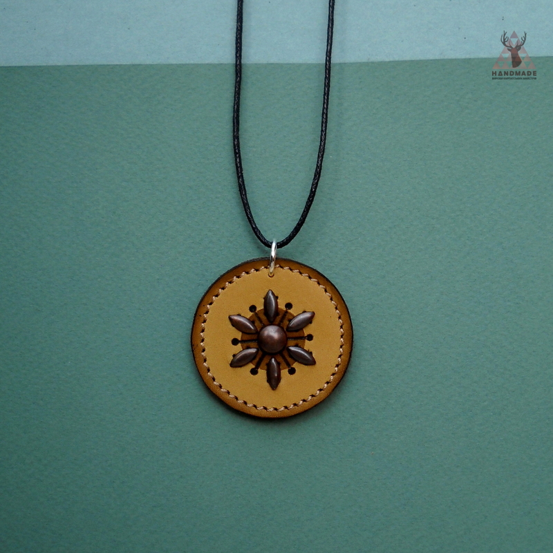 Кулон. Размеры: диаметр 4.5 см. Материалы: кожа, морилка, медные "крабики", металлическая фурнитура, синтетическая нить. Техники: выжигание, тонировка, отделка металлом и ручная прошивка.
