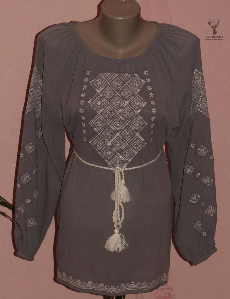 Женская вышиванка, машинная вышивка. Материал серый шифон. Все размеры.
