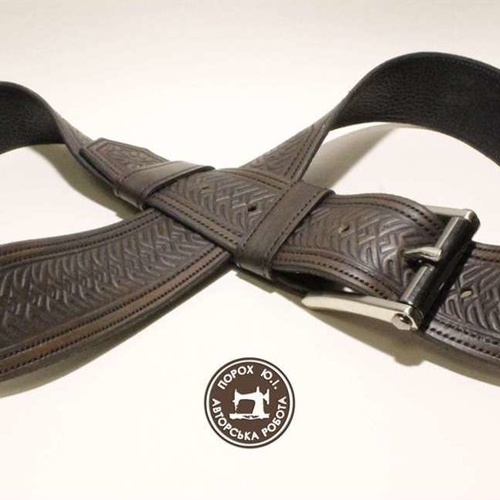 Гуцульський черес. Плетення, воскування. Розміри 15-20×90-120 см. Шкіра рослинного дублення. Пряжки ручноі роботи (мідь, латунь). Термін виконання 1-1,5 місяців.