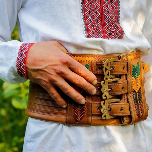 Пояс чоловічий ручної роботи, довжина 90-120 см, ширина 3,5-4 см. Шкіра рослинного дублення. Колір коричневий, чорний.